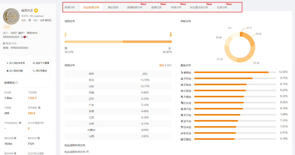 2)在播主詳情頁面中,我們可以快速了解到自己快手號的粉絲數據、視頻數據分析、直播數據分析、直播記錄、快手號電商分析、粉絲重合度分析及禮物情況的分析等,飛瓜數據快手版還有很多的功能,大家可以去使用下。
